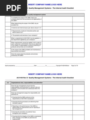 As9100 Rev D Internal Audit Checklist Quality Management System Internal Audit